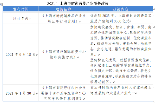 2021年7月19日,上海市、北京市、廣州市、天津市、重慶市,率先開展國際消費中心城市培育建設。當年9月18日,《上海市建設國際消費中心城市實施方案》印發,旨在“十四五”期間將上海率先建成具有全球影響力、競爭力、美譽度的國際消費中心城市,為上海時尚消費產業的發展提供了新的機遇。