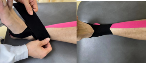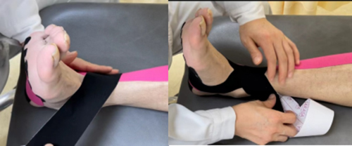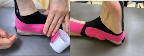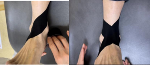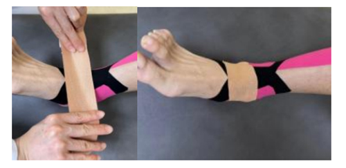 第四步穩定貼扎:采? I形貼布,踝關節中?位,中間為錨固定于跟?下?,兩端分別以?然拉?向內、外踝延展,尾端?拉?固定于內、外踝上?。