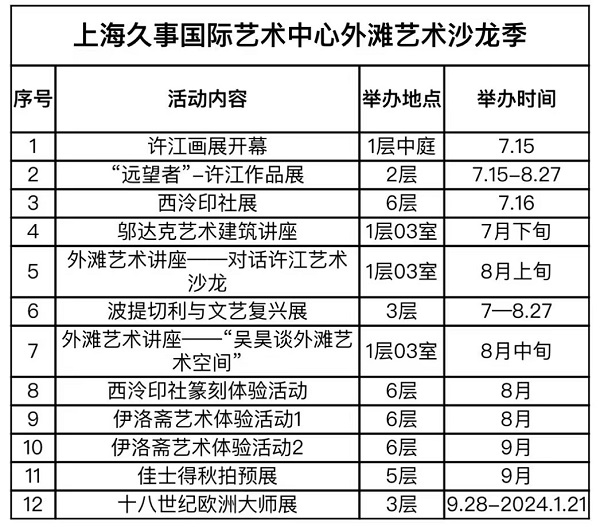 2023上海久事國際藝術中心外灘藝術沙龍季,7月15日開幕,該活動旨在積極推廣上海外灘經典建筑的品牌文化和商業價值,打造久事旗下高品質外灘精品樓宇品牌,將通過藝術展覽、藝術講座和藝術體驗等形式,讓市民和游客近距離感受外灘的人文藝術氛圍。