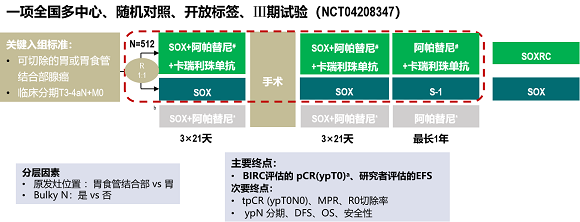 在發布會上,鄭亞南教授介紹了DRAGON IV/AHEAD-G208研究。該研究是一項全國多中心,隨機對照開放標簽的Ⅲ期試驗,旨在驗證阿帕替尼聯合卡瑞利珠單抗和化療對比化療在局部進展期胃或胃食管結合部腺癌圍術期的療效和安全性。該研究在SOX化療方案的基礎上,加入小劑量的阿帕替尼和卡瑞利珠單抗,進行為期3個周期的新輔助治療,然后進行根治性胃癌手術,術后再進行輔助治療和維持治療。