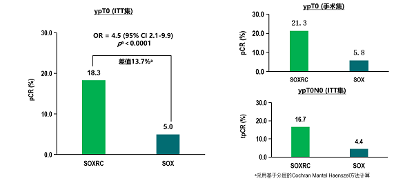 本次公布的360例患者數據中,相較于單純化療,阿帕替尼+卡瑞利珠單抗+SOX化療方案在病理完全緩解率(pCR)上實現了近4倍的顯著提高。數據顯示,靶免化聯合治療組的pCR率為18.3%,而單純化療組為5%,顯著提升13.7%(р<0.0001)。
