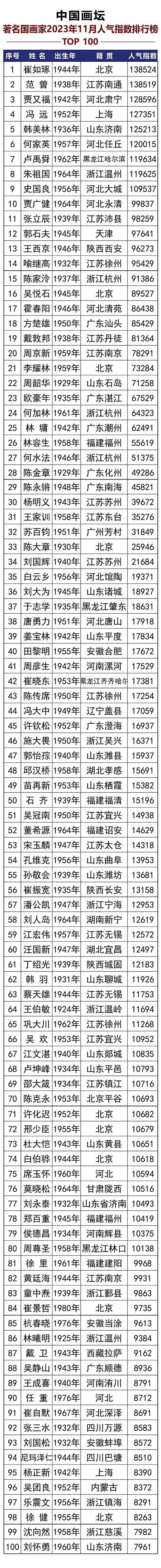 • 中國國畫家2023年11月人氣指數排行榜發布