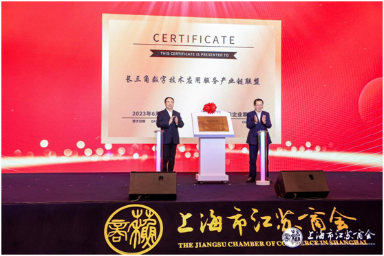 上海市委統戰部副部長、上海市工商聯黨組書記王霄漢,與丁佐宏,為“長三角數字技術應用服務產業鏈聯盟”揭牌。