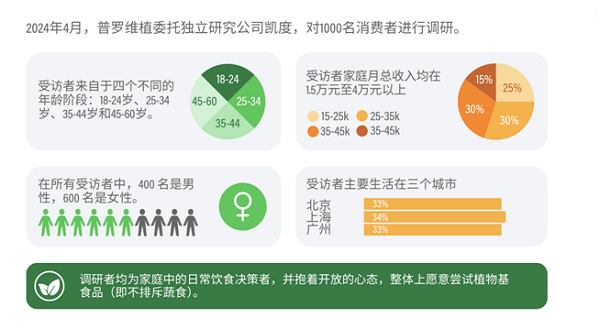 6月11日,普羅維植 (ProVeg International)發布了《蔬食在中國:認知與機會》的消費調研報告。此次調研覆蓋了北京、上海和廣州三地的1000名消費者。參與者家庭月總收入均在1.5萬元以上,其中400名為男性,600名為女性。所有調研對象均為家庭中的日常飲食決策者,并對蔬食植物基食品持開放態度。報告顯示,一旦了解到蔬食飲食的健康和環境益處,98%的受訪者表示,會增加蔬食飲食的攝入。