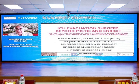 UCM Issam A.Awad教授帶來題為“Intracerebral Hemorrhage Evacuation: beyond MISTIE and ENRICH”的學術報告。他首先對腦出血進行概述,然后結合MISTIE、STICH、ENRICH等國際經典研究及多中心隨機試驗的新進展及自己20多年的研究所得,探討分析腦出血清除的不同治療方法、治療時間窗等的生存獲益、功能獲益及臨床獲益,為大家帶來國際前沿的信息和知識。