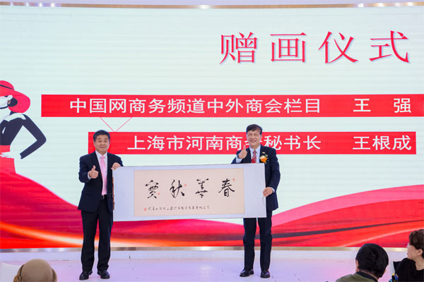 中國網商務頻道中外商會欄目王強向本屆組委會負責人、上海市河南商會秘書長王根成,向協辦單位浙江夢娜襪業股份有限公司、上海香奈食品有限公司代表贈送字畫。