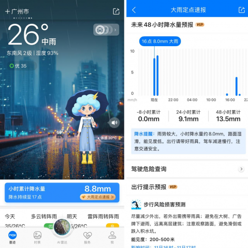臺風帶來的強降水往往比大風更具破壞性。墨跡天氣基于其高時空分辨率預報能力的大雨定點速報、分鐘級降水地圖功能可以幫助用戶先一步了解降水情況。通過監測和預測未來短時間內某具體區域(如街道、社區)將出現強降雨時,大雨定點速報會及時推送預警信息,提醒用戶該地點即將面臨強降水風險,還結合降水情況提供步行、騎行、駕駛三種出行方式的建議。