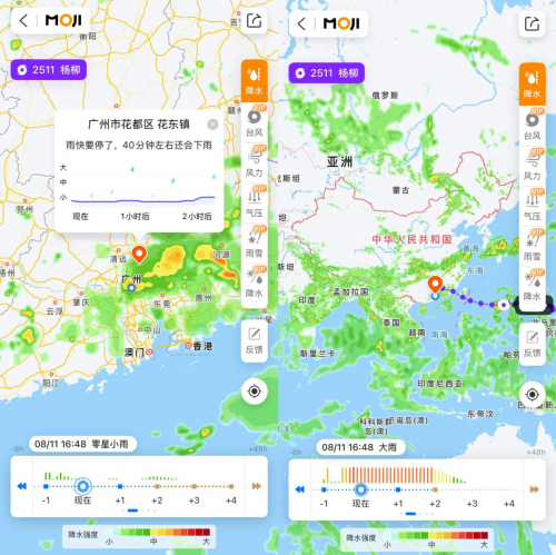 降水地圖通過動態可視化雷達圖,清晰呈現未來48小時內分鐘級的降雨分布、強度與移動趨勢,讓用戶直觀掌握自身及周邊區域的實時雨量、雨勢及未來變化,精準把握雨帶動態,為出行規劃與低洼地帶防范提供直接依據。