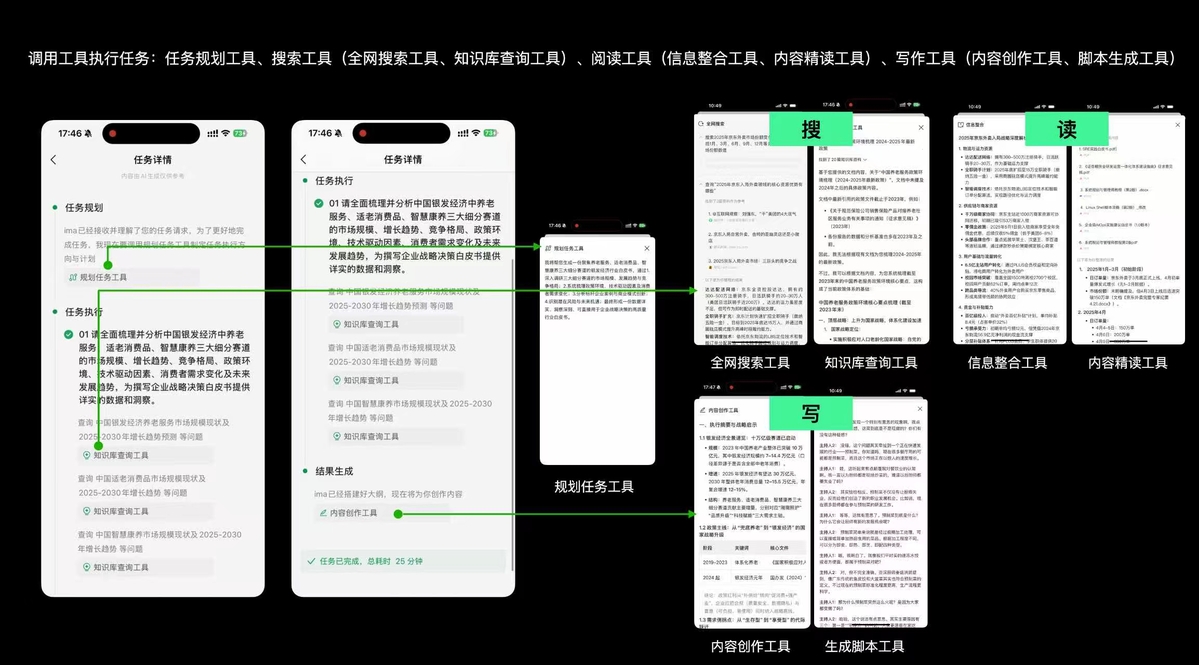 用戶開啟“任務模式”后,ima將基于全網或知識庫數據,通過LLM自主拆解、規劃任務步驟,并調用精讀內容、全網搜索、知識庫查詢、內容創作等工具完成用戶輸入的指令,并在執行過程中自我監測與修正,最終產出可直接使用的結果。如輸入“幫我寫一份新能源汽車市場報告”、“整理會議討論的要點并生成紀要”、“為我設計一節‘生成式 AI’教學播客”,擁有agent能力的“任務模式”,將深度學習和理解自然語言里的“藏”的任務,拆解規劃成一個個工作節點,深度利用全網信息的“全”和知識庫資料的“精”,將搜讀寫的工作流一體化。